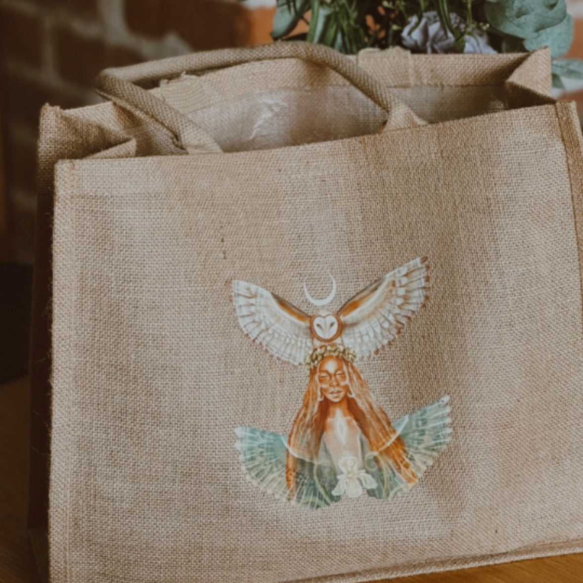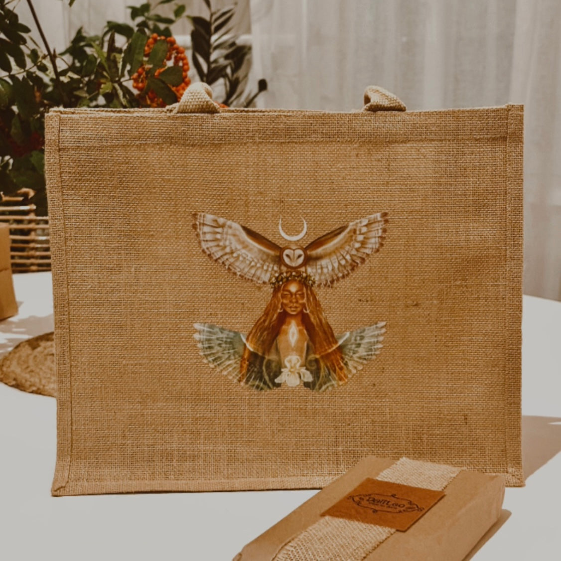 Tekstiilist sangadega jute kangast kott. Sangade pikkus on 21cm.